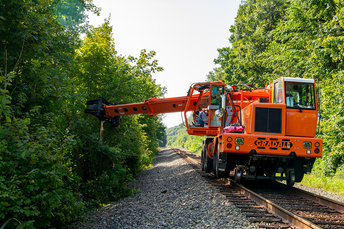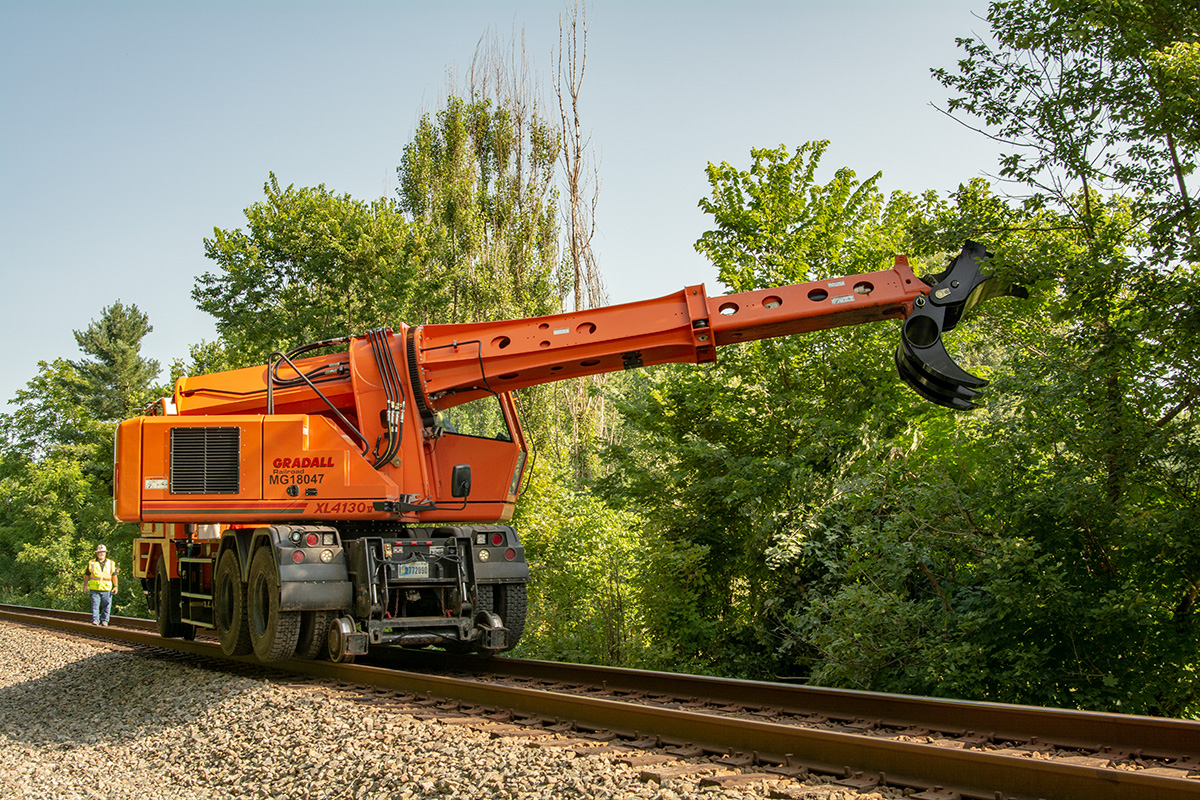 “Mostly, we use the Gradall for ditching, but it also is very useful for tree removal, ballast restoration, cleaning up washouts and removing mud from around the track and ties,” said Adkins. “It’s a very necessary machine for track work.”